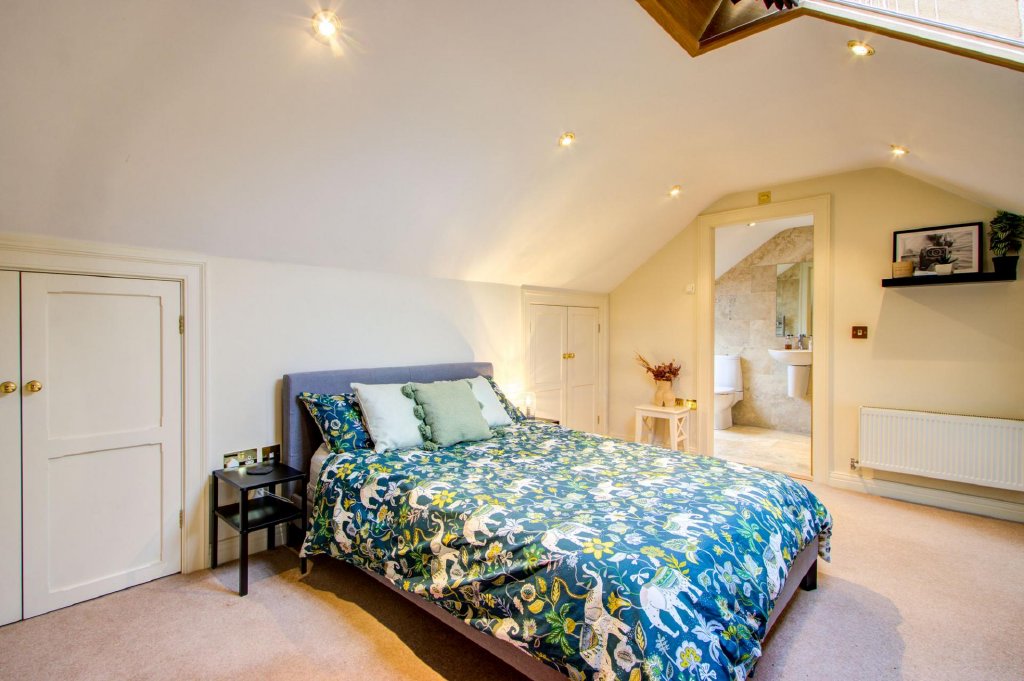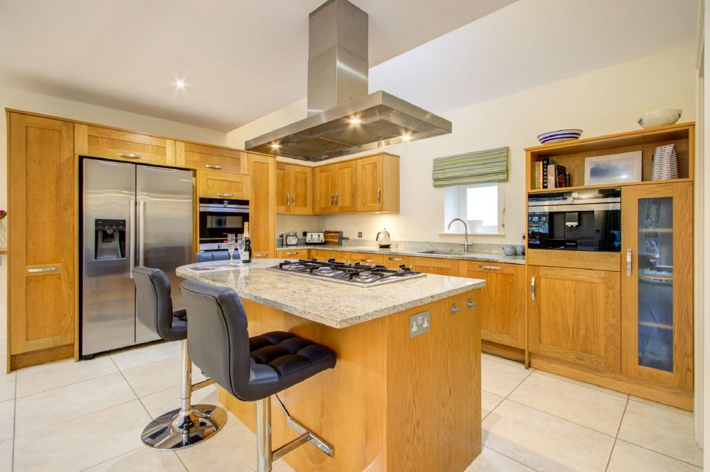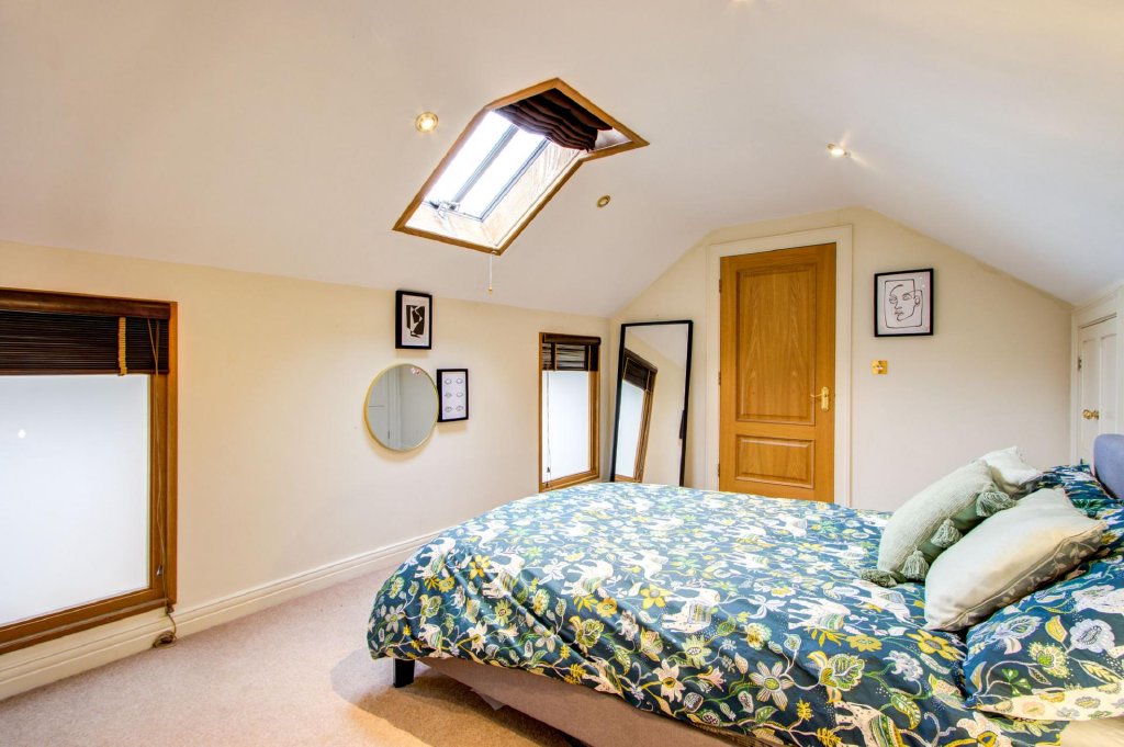 At the heart of the home is the magnificent open-plan kitchen, dining and living space, flooded with natural light from heritage roof lights and garden-facing windows. The kitchen itself is beautifully appointed with granite worktops, a large central island, breakfast bar seating and an excellent range of premium integrated appliances. With space for a large dining table, it’s ideal for both family life and entertaining. A convenient utility room sits just off the kitchen.