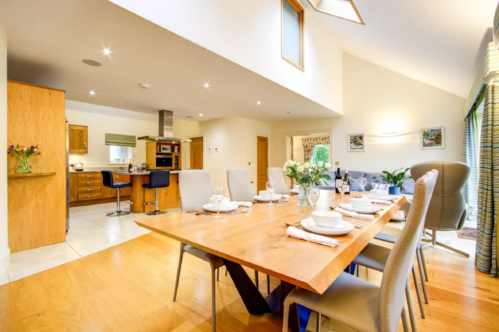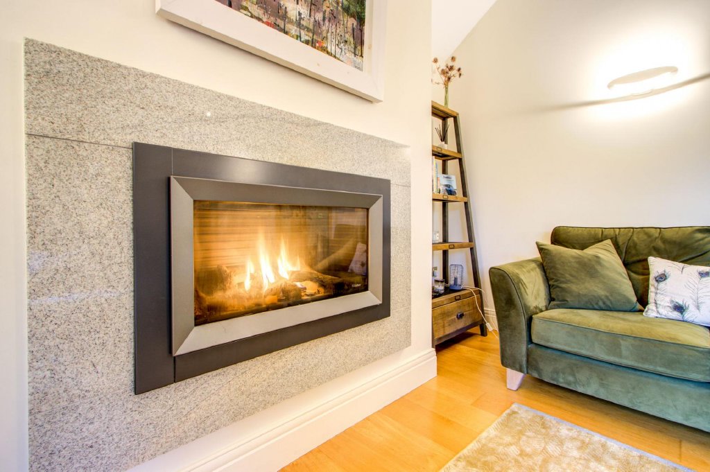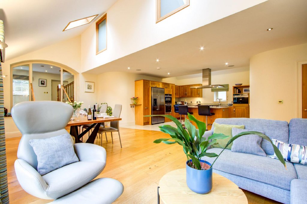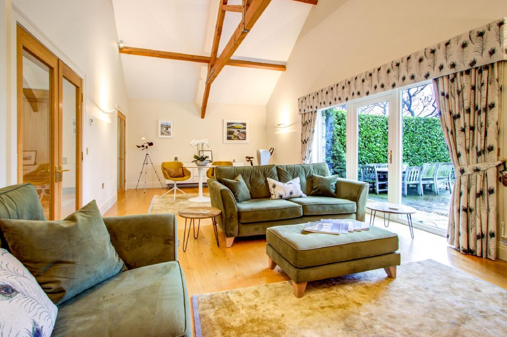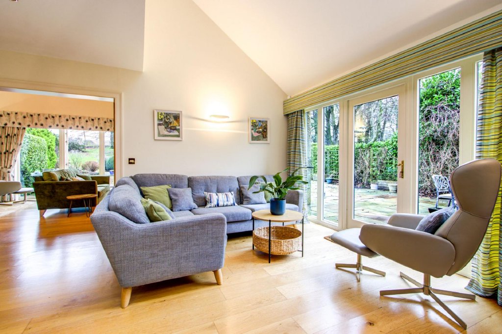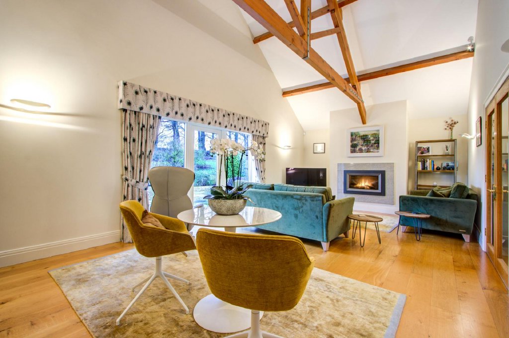 The main sitting room is a real showstopper. With its full-height vaulted ceiling, exposed beams, and contemporary gas-flame fire, it’s both dramatic and inviting. Featuring expansive windows and a door opening directly onto the terrace and garden, there is a seamless connection to the outdoors.
