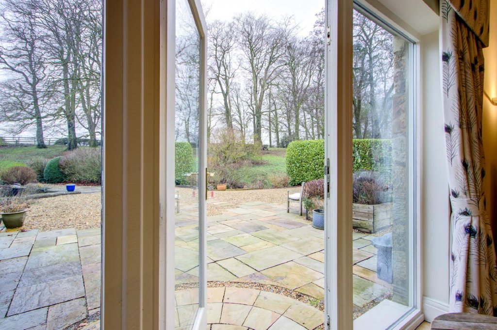 A versatile home office or study opens onto a raised stone terrace, perfect for those working from home.