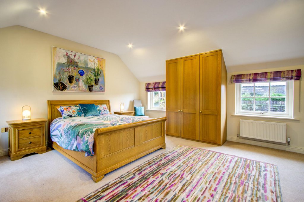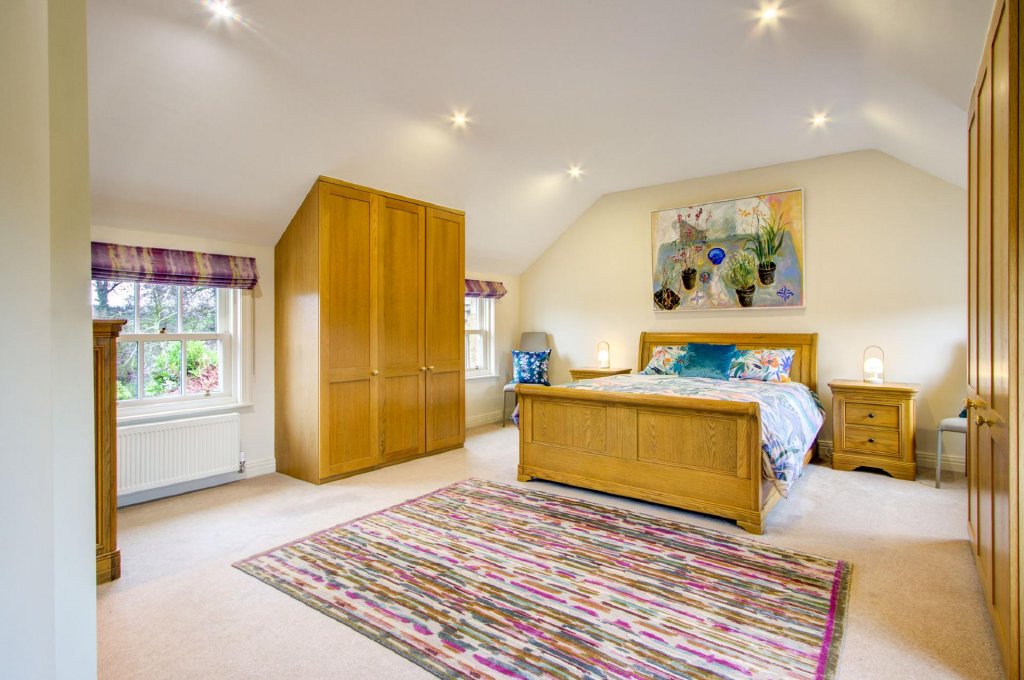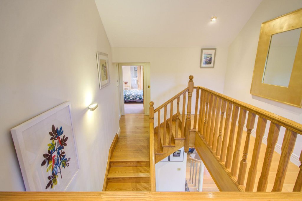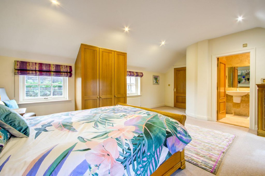 Upstairs, the galleried landing adds a further sense of space and architectural interest. The principal bedroom is a luxurious retreat, with dual-aspect views, fitted wardrobes and a beautifully finished ensuite. A further double bedroom is served by a stylish family bathroom and a guest bedroom with en-suite shower room is positioned to the other side of the stairs, providing added privacy.