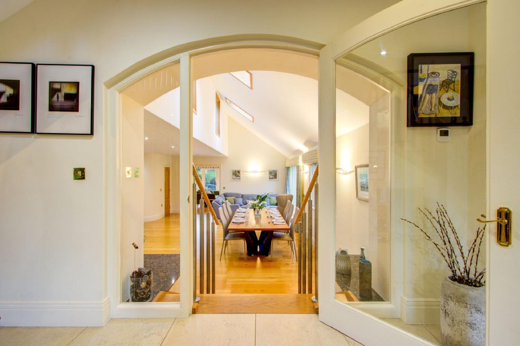 The reception hallway sets the tone immediately; light-filled and welcoming, with a striking arched window and porcelain tiled flooring.