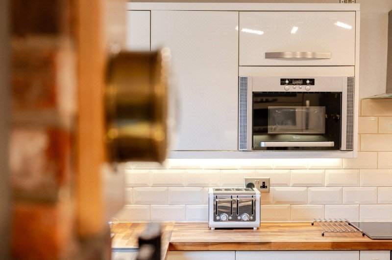 The kitchen has been completely refitted to a high specification, combining contemporary cabinetry with quality worktops and integrated appliances. A central breakfast bar provides informal seating, while views across the garden and countryside beyond are drawn into the space through well-positioned windows.