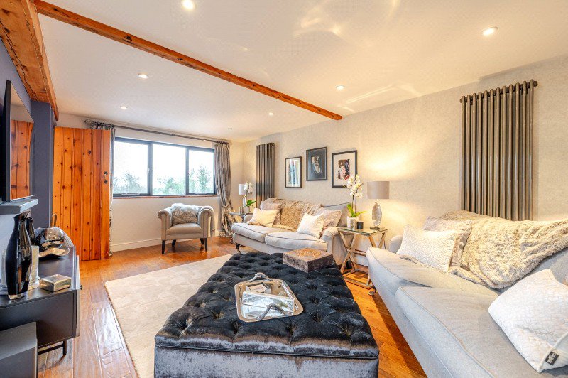 The entrance hall immediately showcases the heritage of the original cottage, with exposed beams and an impressive inglenook fireplace and bread oven creating a warm and characterful first impression.