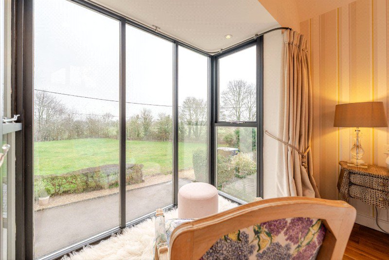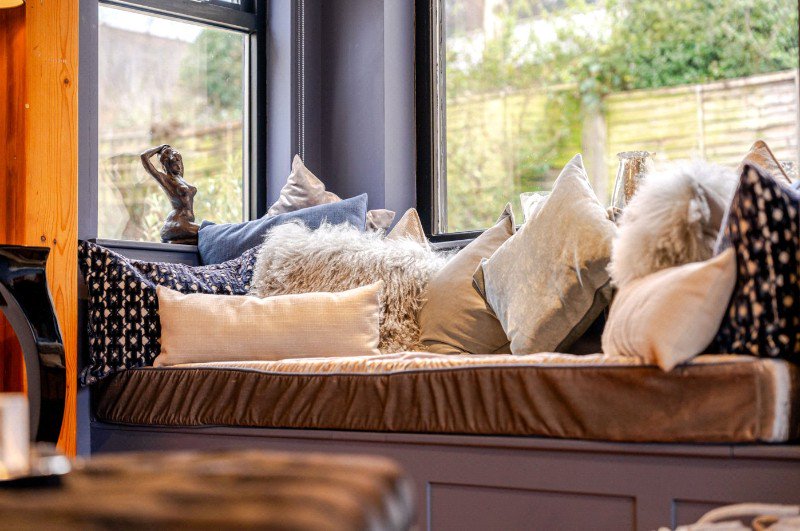 A further living room to the rear enjoys a bright dual-aspect outlook with a window seat and views to the extended terrace and garden, creating a strong indoor–outdoor connection and allowing the south-facing garden to be enjoyed throughout the seasons.