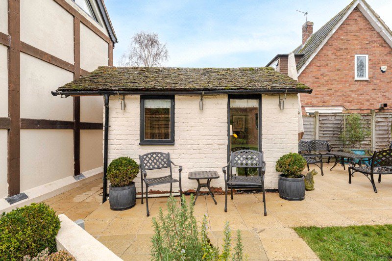 To the side of the terrace sits a separate outbuilding, formerly a stable, now converted into a high-quality home office. Thoughtfully adapted, it also incorporates a boiler cupboard, plumbing for a washing machine and a practical dog shower—an excellent addition for rural living.