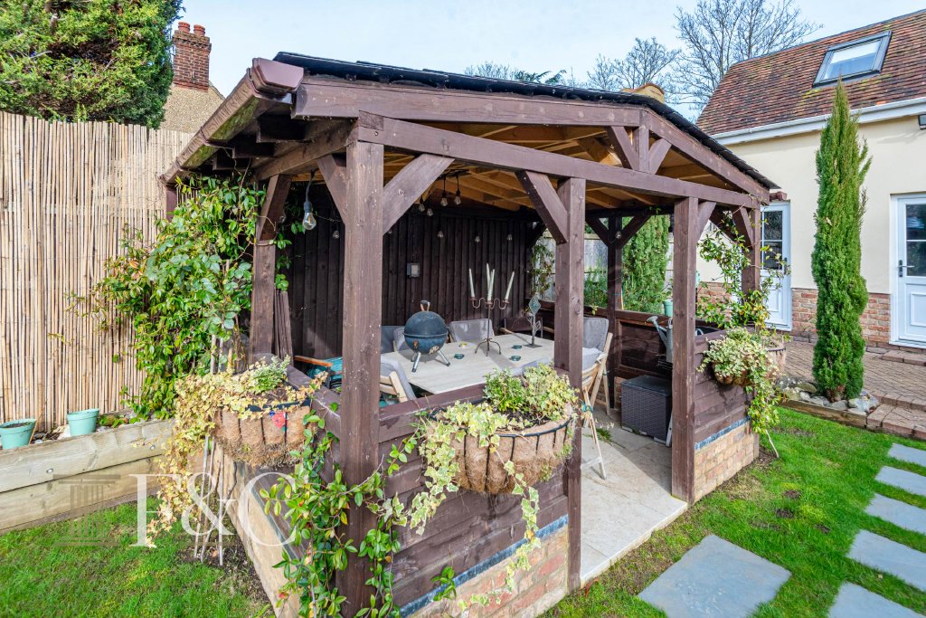 The exterior of the property is equally impressive, featuring a gated driveway that provides privacy and security. The landscaped rear garden is a tranquil retreat, complete with a covered gazebo, perfect for enjoying the outdoors. Additionally, the property includes a detached double garage/workshop and an annex that can serve as a studio, treatment room, or guest accommodation.