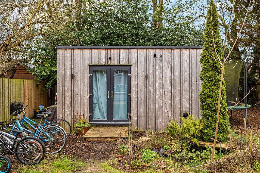 The mature rear garden offers a wraparound patio, lawn, established planting and a contemporary, fully insulated studio with power and lighting — ideal for work or leisure use.