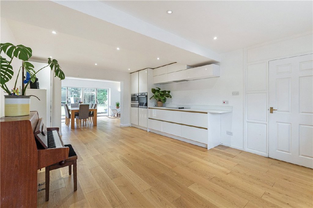 The ground floor centres around a generous open-plan living/dining area formed from three connected spaces: a broad kitchen/breakfast room with extensive storage and integrated appliances including an oven, combi-oven, warming drawer, electric hob with extractor, and dishwasher; a spacious family/dining zone with three skylights and full width bi-fold doors leading onto the rear gardens; and an adjoining sitting room. A separate wing adds valuable versatility, incorporating a utility area (with scope to convert to a kitchenette), a shower room, a second staircase and a family room/bedroom five.