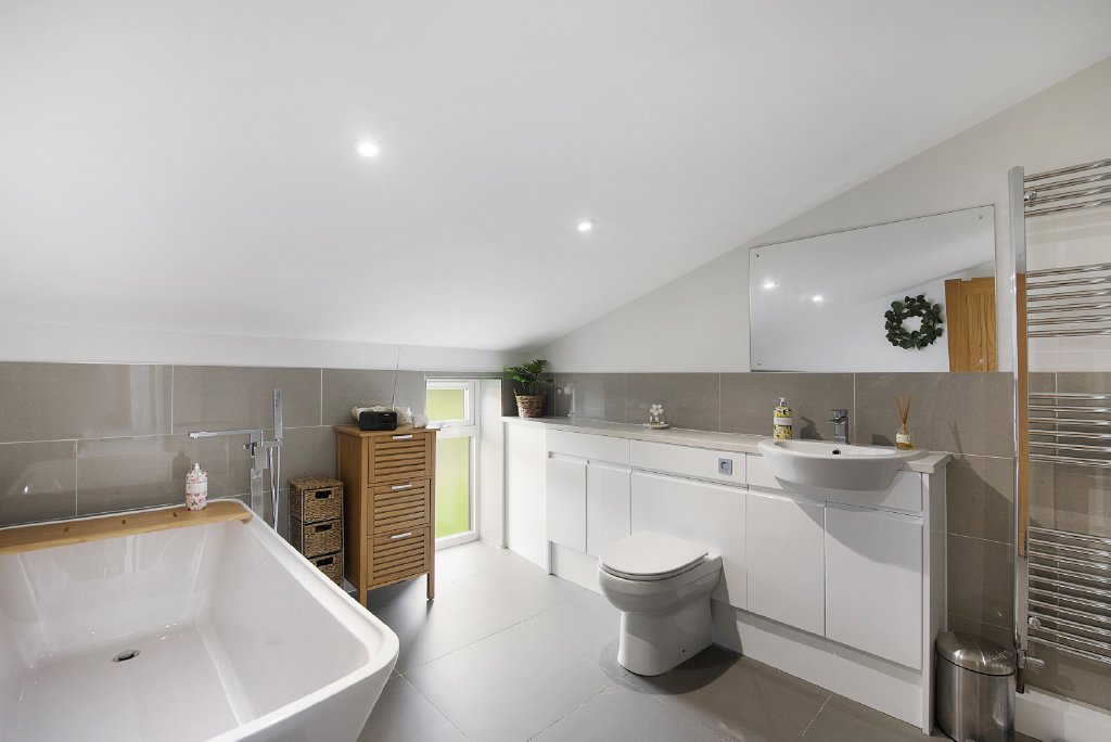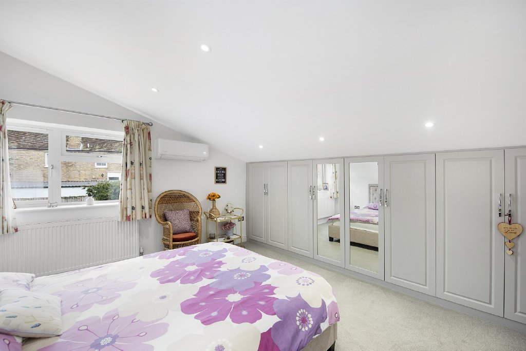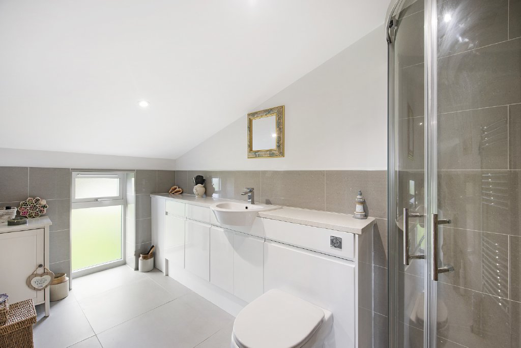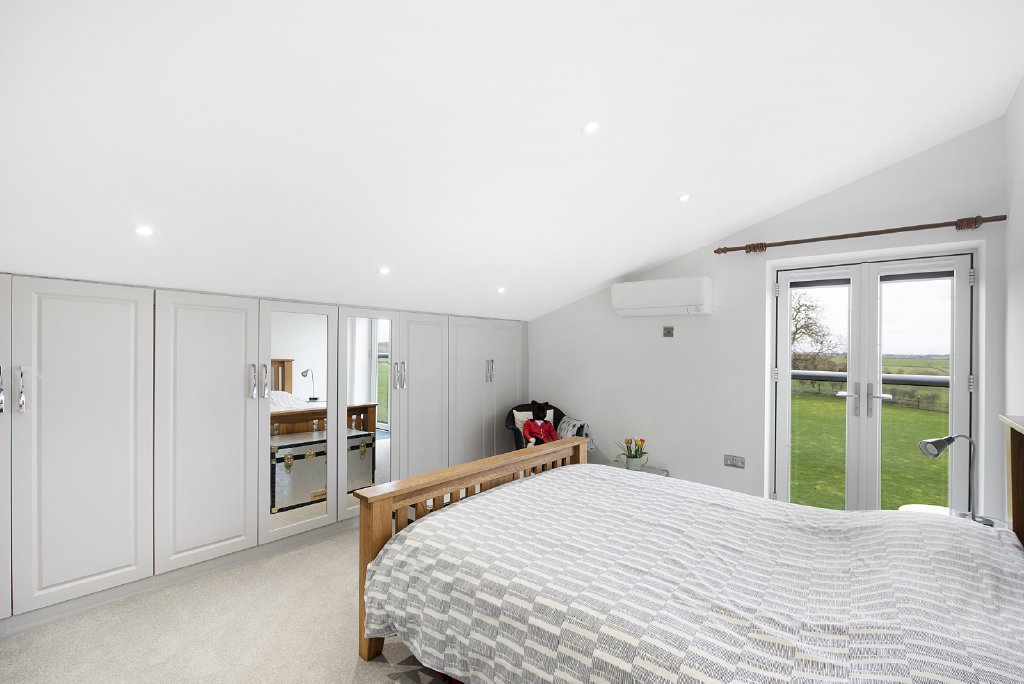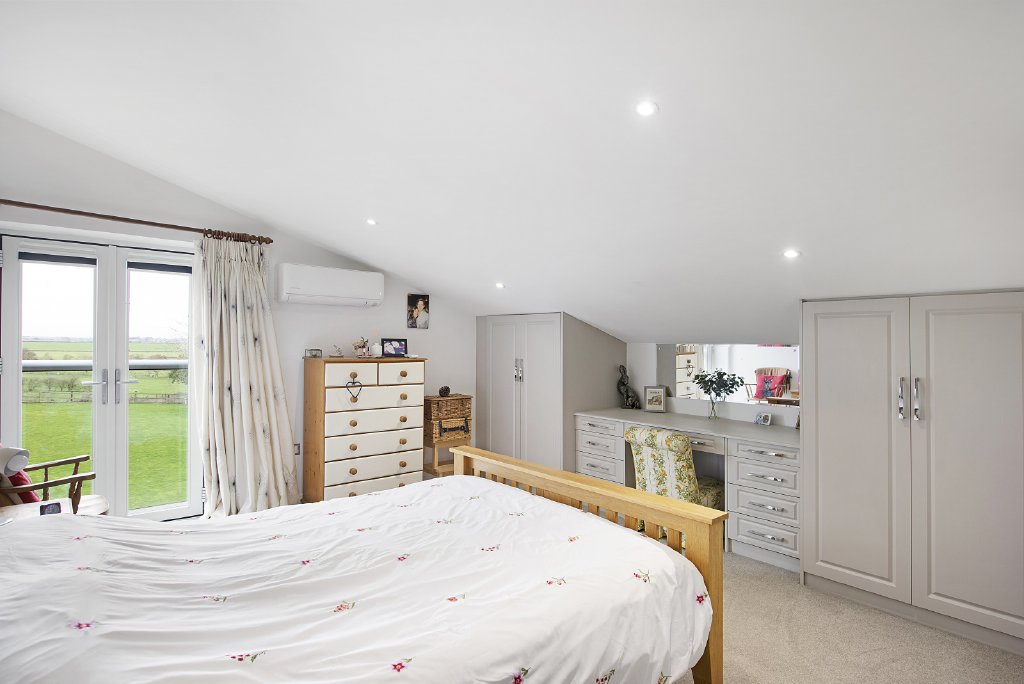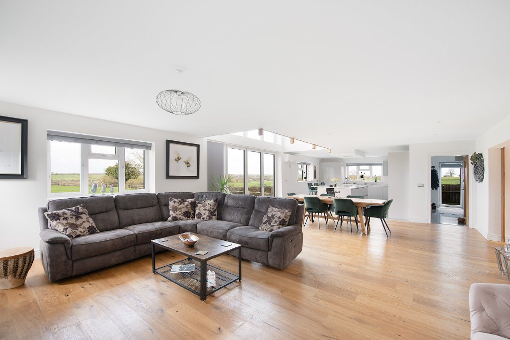 A well-equipped utility room provides additional storage and side access. Engineered oak flooring extends across much of the ground floor, complemented by underfloor heating powered by an air-source system.