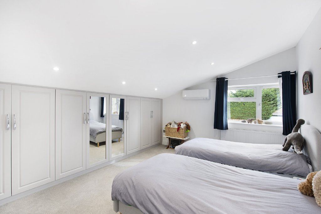 Upstairs, the light-filled galleried landing leads to four generously proportioned double bedrooms, all with fitted wardrobes. Two benefit from en suites, while the principal suite also enjoys a superb dressing room with glazed oak sliding doors and bespoke storage. The family bathroom is luxuriously appointed with a freestanding double-ended bath and walk-in wet-room style shower.