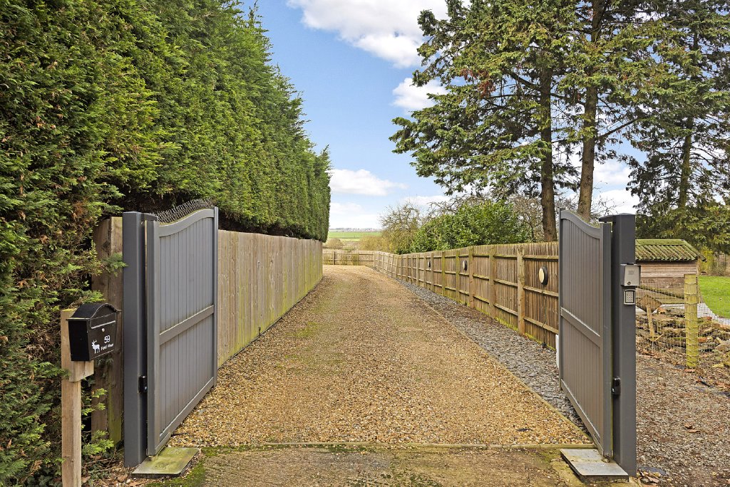 Electric gates open to a sweeping gravel driveway, setting an impressive tone of arrival. The naturally weathering Siberian larch exterior and standing seam roof with integrated solar panels reflect both architectural integrity and environmental consideration.