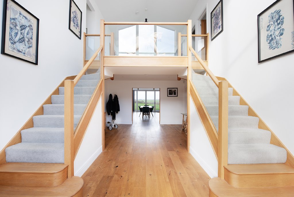 The reception hall is a dramatic introduction, with full-height glazing flooding the space with natural light. Twin oak staircases with glass balustrades rise to a magnificent galleried landing, creating a striking focal point and versatile study or reading area.
