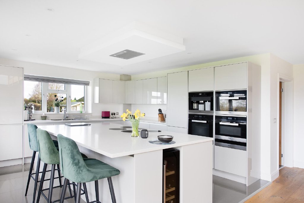 The 43 ft. kitchen/breakfast/family room forms the heart of the home. A vaulted ceiling and extensive glazing, including bi-fold and French doors, maximise the rear outlook and provide seamless access to the terrace. A wood-burning stove adds warmth to the seating area, while the beautifully appointed kitchen features white granite worktops, lacquered cabinetry and a comprehensive range of integrated appliances, including Miele steam and pyrolytic ovens, combination microwave, coffee machine and induction hob set within a central island with breakfast bar and wine cooler.