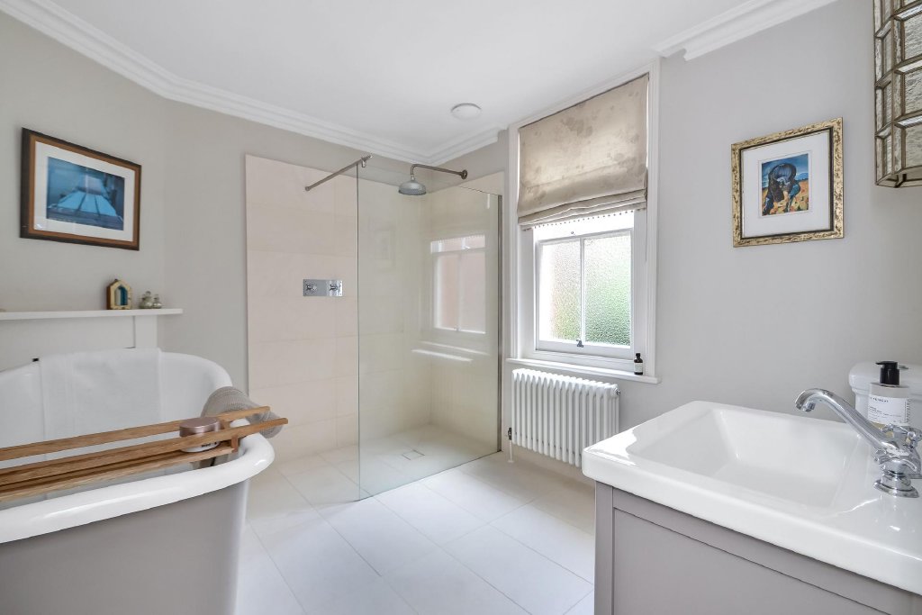 FEATURE BATHROOM 9' 9" x 8' 7" (2.97m x 2.62m) Tubby Torre high sided bath with wall mounted mixer tap and panelling behind, corner chimney breast with fireplace and cast iron inlay, tiled flooring, close coupled w.c., wash hand basin with mixer tap and cupboards under, tiled splashback, frosted sash window to side aspect with roll top radiator under, ceiling coving, extractor fan, wet room shower area with large shower screen and drench style hood with wall mounted controls, panelled door.