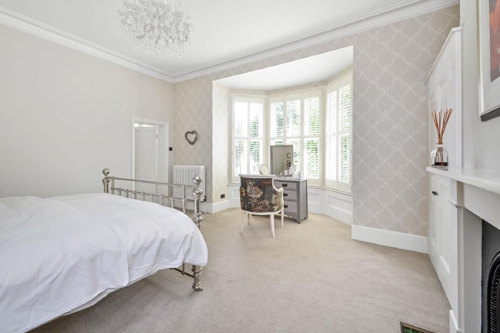 BEDROOM 1 18' 0" into bay window x 17' 2" (5.49m x 5.23m) Sash bay window to front aspect with plantation shutter blinds and panelling under, two roll top radiators, central chimney breast with painted stone surround fireplace, tiled hearth and cast iron arched inlay, built-in double doored wardrobe to one side, panelled door, ceiling coving, door to: