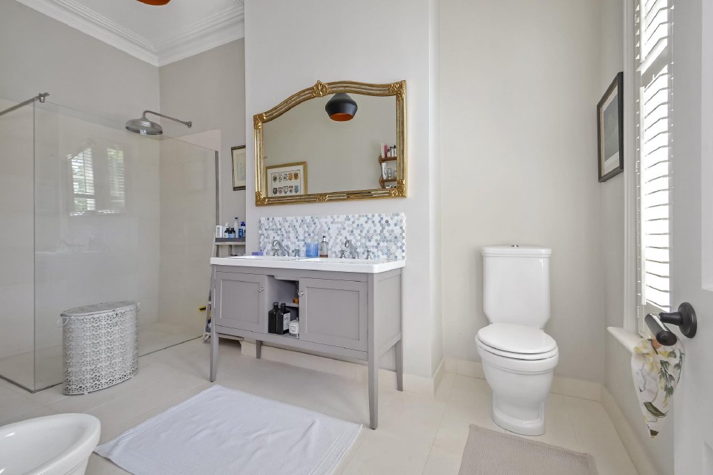 EN-SUITE WET ROOM 13' 9" x 7' 9" (4.19m x 2.36m) Large wet room shower area with drench style hood and wall mounted controls, large shower screen and floor drain away, twin sink units with mixer taps and cupboards under, close coupled w.c., bidet, roll top radiator with cast iron towel rail over, high ceiling with coving, sash window to front aspect with plantation shutter blinds, panelled door.