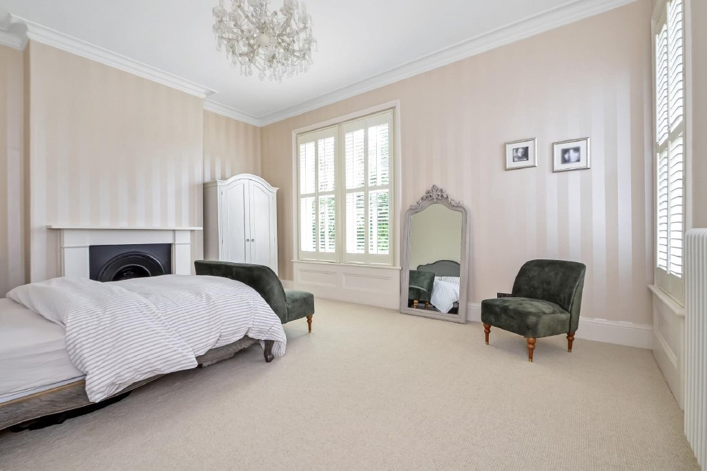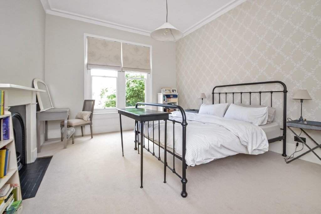 BEDROOM 3 16' 5" x 12' 8" (5m x 3.86m) High ceiling with coving, twin sash windows to rear aspect overlooking garden, painted stone surround fireplace with cast iron arched inlay and painted tiled hearth, roll top radiator, panelled door.