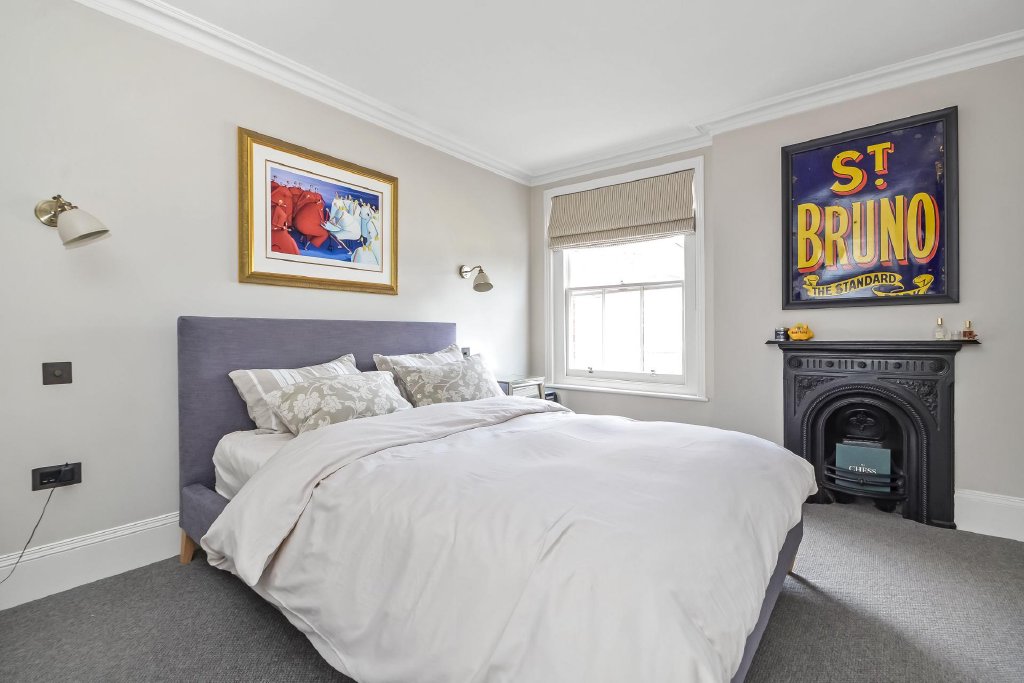 BEDROOM 2 17 ' 6" x 13' 11" (5.33m x 4.24m) Sash window to side aspect with plantation shutter blinds, roll top radiator, panelled door, high ceiling with coving, twin sash windows to front aspect with plantation shutter blinds and panelling under, central chimney breast with painted stone surround fireplace and cast iron arched inlay with tiled hearth, dimmer switch.
