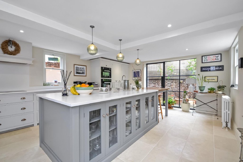 KITCHEN / BREAKFAST ROOM 21' 8" x 15' 5" (6.6m x 4.7m) Crittall door to rear with full height matching window to one side, twin sash windows to side aspect with two cast iron radiators under, bespoke deVol kitchen including large central island with natural stone work surface and glass fronted shelving under and large wooden breakfast bar to one end, butler sink with twin bowls, drainer to one side with mixer tap and instant hot water tap, integrated Smeg dishwasher with matching door, bin drawer, ceiling spotlights, to one wall are full height integrated fridge and freezers with matching doors, matching tiled flooring, eye-level Smeg oven and grill with drawers under and storage cupboard over, open bookshelves, sash window to side aspect, inset AEG induction hob with extractor hood, fan and light over, pan drawers under, ceiling spotlights with zoned lighting, twin doors leading to: