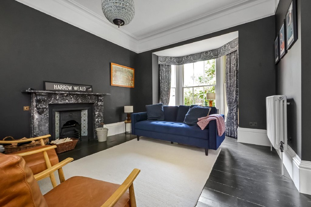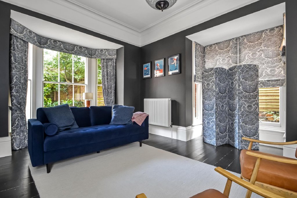SITTING ROOM 19' 11" x 15' 9" into bay window (6.07m x 4.8m) Square bay window to side aspect with low sill, further bay window to rear overlooking rear garden, high skirting boards, ceiling rose and coving, two roll top radiators, granite surround fireplace with cast iron inlay and black tiled hearth, panelled door, dimmer switch.