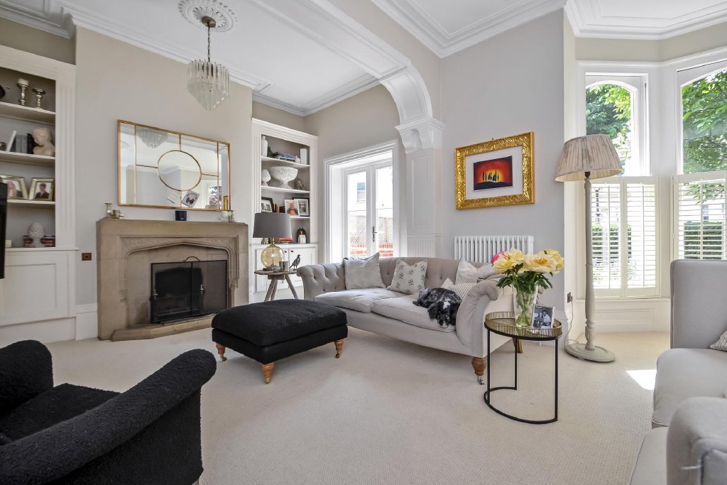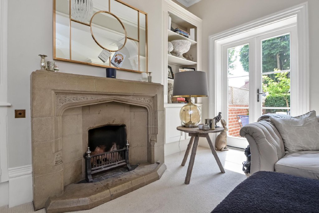 DRAWING ROOM 26' 0" x 17' 11" into bay window, decreasing to 13'0" at narrowest point (7.92m x 5.46m) Feature arched opening with pillared architraves, central chimney breast with stone surround fireplace and matching hearth, built-in open shelving and cupboards to either side, ceiling rose and coving, double glazed French doors leading to small patio area and front garden, two roll top radiators, feature bay window to front aspect overlooking garden with plantation shutter blinds to lower section, high skirting boards, dimmer switches.