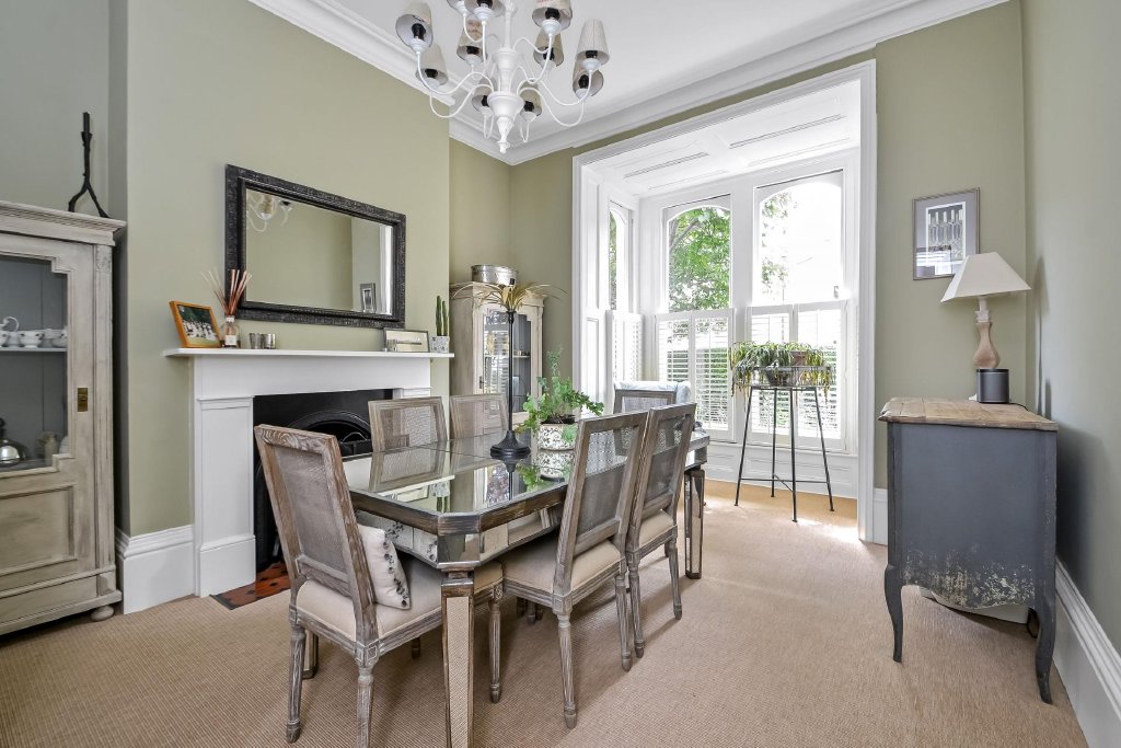 DINING ROOM 17' 7" x 12' 5" (5.36m x 3.78m) Sash square bay window to front aspect with plantation blinds to lower section and panelling to either side and over, central chimney breast with surround fireplace, cast iron arched inlay and tiled hearth, high skirting boards, ceiling rose and coving, panelled door, dimmer switch, roll top radiator.