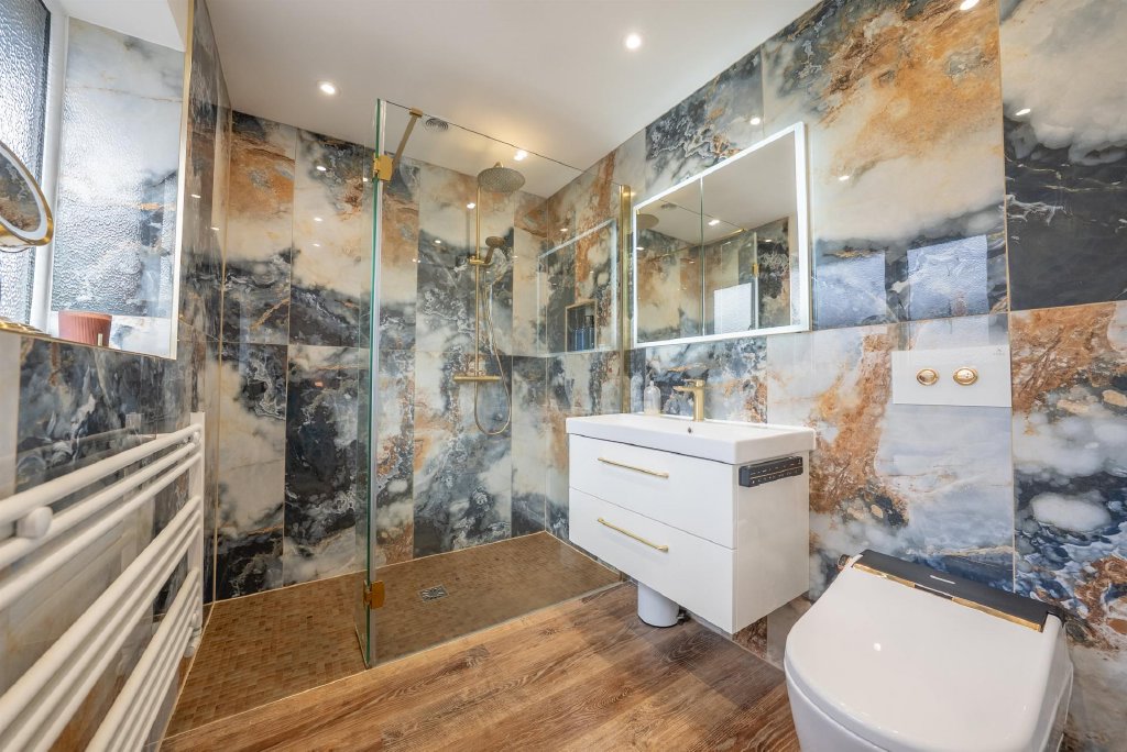 An exceptional principal suite, finished with striking New Zealand stone detailing that adds texture and sophistication, there is also a high spec Japanese toilet. The remaining bedrooms are equally well-proportioned, offering flexibility for children, guests or home working. Every space has been designed to feel inviting, practical and ready to enjoy from day one.