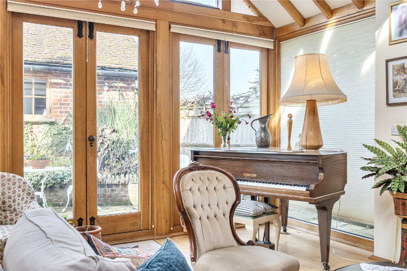 At the heart of the home lies a stunning open plan, vaulted kitchen/dining/family room, flooded with natural light and perfectly suited to both everyday living and entertaining. Three sets of casement doors open directly onto the garden, enhancing the sense of space and connection to the outdoors. Throughout the cottage, exposed beams, traditional detailing and an impressive inglenook recess provide charming reminders of the property’s heritage. A separate ground-floor study offers an ideal space for home working. A further reception room is currently arranged as a formal dining room. A second staircase from the sitting room leads up to the principal bedroom on the first floor. Underfloor heating runs throughout the ground floor, adding contemporary comfort.