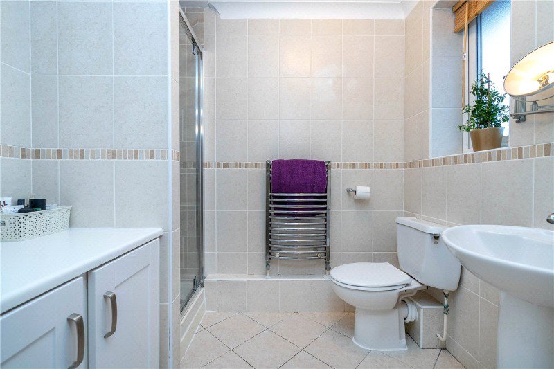 With frosted UPVC window to front aspect, modern suite with close coupled wc, pedestal wash hand basin, recessed tiled shower cubicle with shower over, fully tiled walls, heated towel rail.