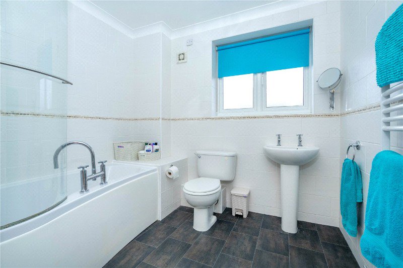 With frosted UPVC window to rear aspect, comprising a modern three piece suite, low level WC, wash hand basin and curved panel bath with glass screen and shower over, fully tiled walls and heated towel rail.