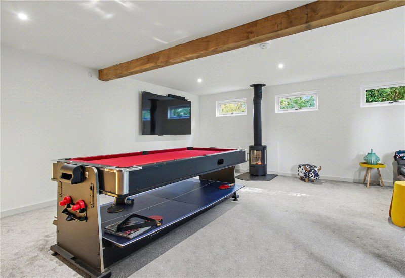 Within the grounds sits a substantial lodge-style annexe constructed approximately three years ago. Originally designed with three garages beneath, two bays have been converted into a gym/games room complete with its own log burner. Above, a fully insulated living space — with planning consent for use as an Airbnb or for family occupation — provides a reception area with kitchenette, a bedroom and shower room, currently offering a valuable supplementary income stream. The property further benefits from a recently installed wastewater treatment system and connection to mains gas, ensuring practical modern living within a historic framework. A brick outbuilding presents additional potential for conversion into further ancillary accommodation, a studio or utility space, subject to the necessary consents.