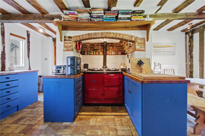Approached via a sweeping driveway leading to a generous shingle parking area, the house is framed by gardens that wrap around the property, interspersed with mature deciduous trees and offering a delightful sense of seclusion. The principal hallway sets the tone, leading through to a characterful dining room rich in exposed timbers and centred around a substantial fireplace, creating an atmospheric setting for both formal dining and relaxed gatherings. Twin doors open into the Victorian reception room, a wonderfully light dual-aspect space with bay windows to either side and a log-burning stove providing warmth and ambience — an ideal room for entertaining on a grand scale. The kitchen sits adjacent, featuring a range cooker set within a fireplace surround, timber-fronted cabinetry and tiled flooring, combining practicality with period charm. Beyond lies a utility room and ground floor cloakroom. To the opposite side of the house, a snug or sitting room offers a more intimate retreat, perfect for quieter evenings. A ground floor bedroom served by a shower room provides flexibility, whether for guests, multigenerational living or single-level accommodation.