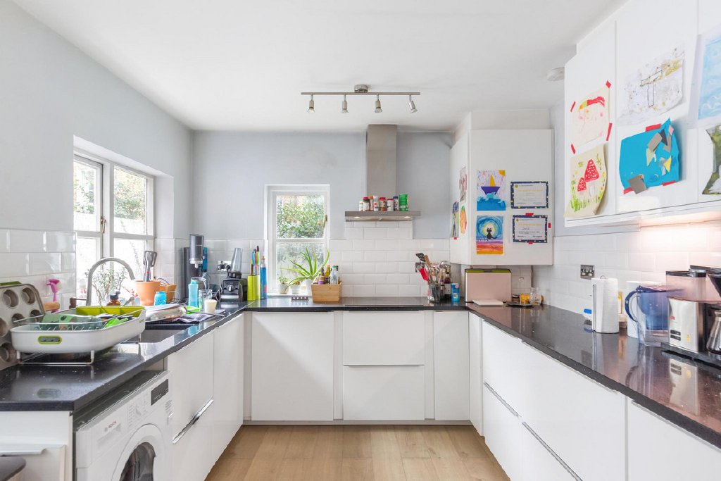 To the rear, the kitchen is thoughtfully arranged and enjoys excellent natural light, opening directly onto the south-west facing garden. This connection between indoor and outdoor space creates a bright and airy environment, perfect for dining al fresco and hosting during the warmer months.