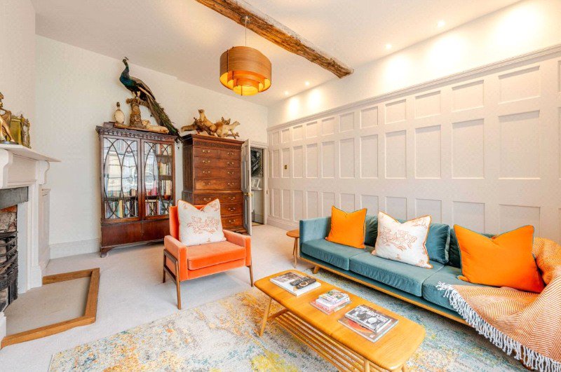 The elegant front sitting room enjoys a traditional fixed sash window overlooking Church Street, original wooden flooring and an open fireplace — a beautifully proportioned reception room rich in period charm.