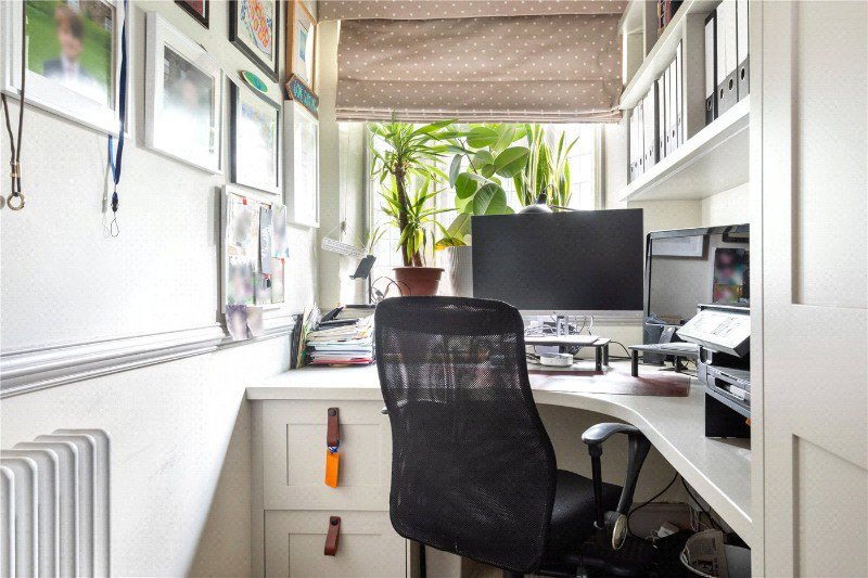 The first floor hosts three generously sized bedrooms. The additional bedrooms are well-proportioned and share a stylish family bathroom. A study room offers a dedicated space for home working. The second floor features a principal bedroom complete with an ensuite shower room.