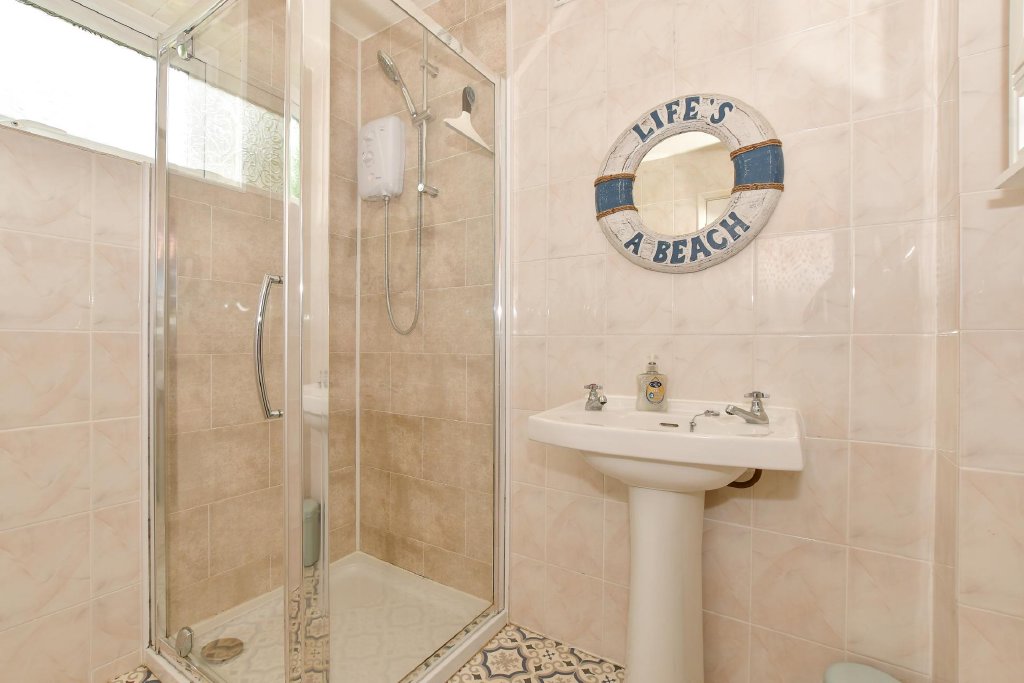The home also includes a well-appointed shower room, featuring a modern shower cubicle and hand basin, finished with stylish contrasting wall and floor tiling, serving the ground floor bedrooms. Additionally, there is a separate WC for convenience.