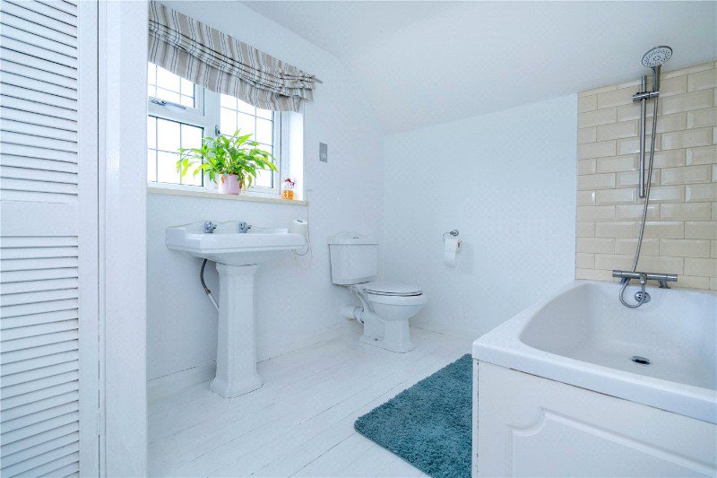 10'4 x 7'4 with UPVC window to the rear aspect, comprising a three piece suite, low level WC, pedestal wash hand basin and panel bath, recessed airing cupboard, radiator and white washed wood flooring.