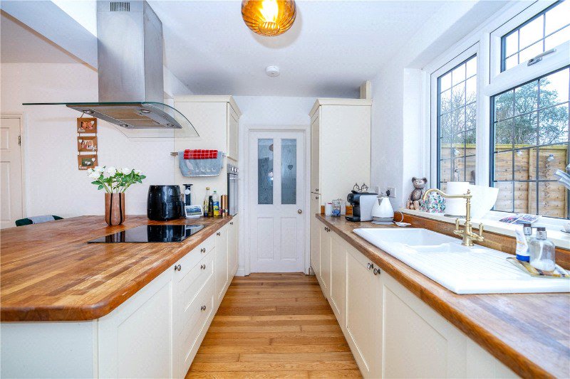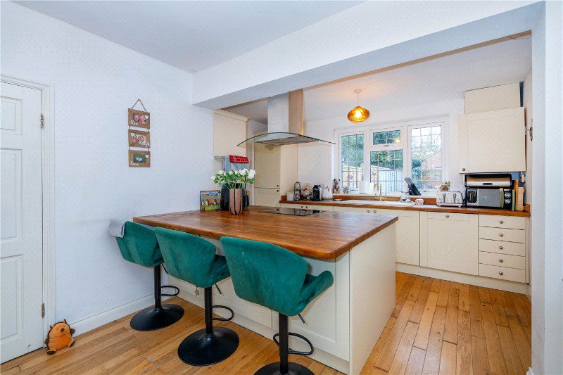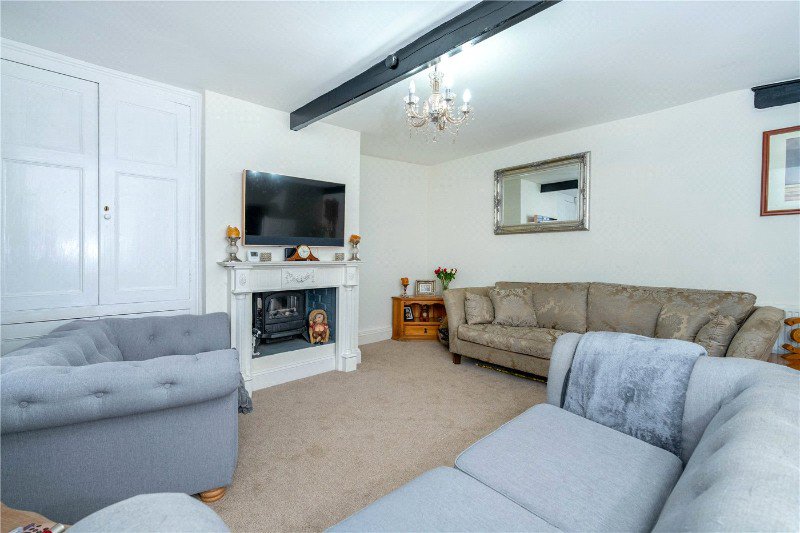 12'7 (min) x 22'11 a great space for the family to gather, with UPVC bay window to the front aspect and further UPVC window to the rear aspect, ample space for dining table, the kitchen area comprises a range of base and eye level storage units, solid wood work surface with ceramic sink inset and mixer tap over, integrated oven and central island unit with electric hob inset, stainless steel and glass extractor fan over, breakfast bar, integrated fridge and freezer, integrated dishwasher, exposed beams, wall mounted boiler, radiator, power points and engineered wood flooring.