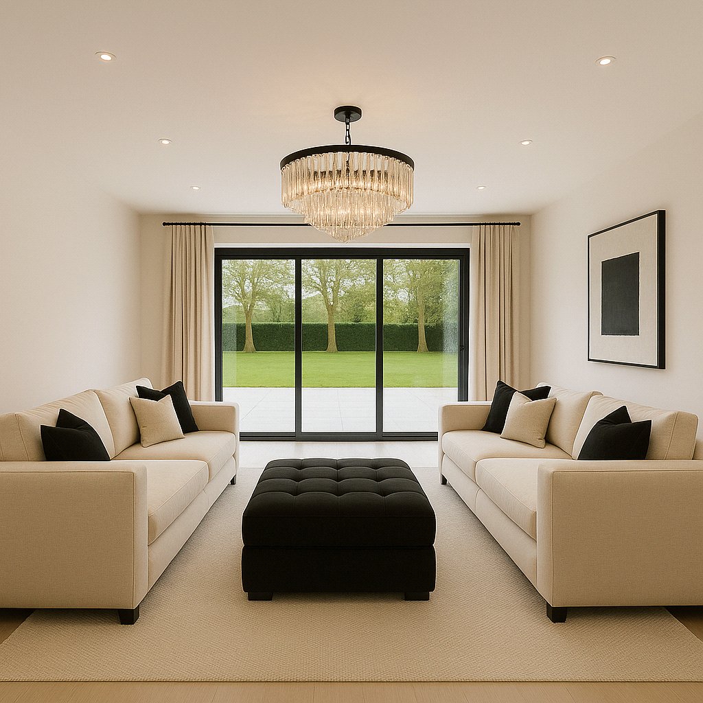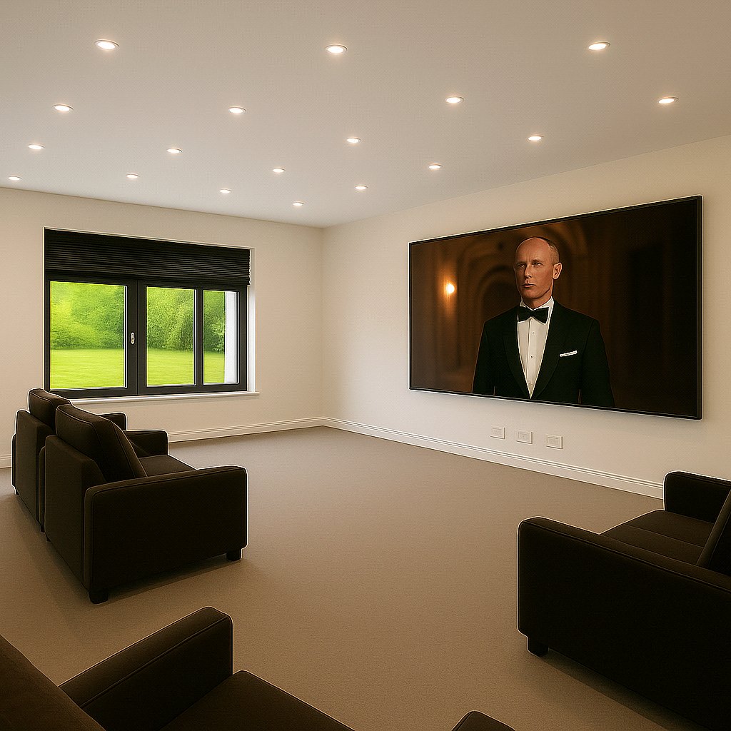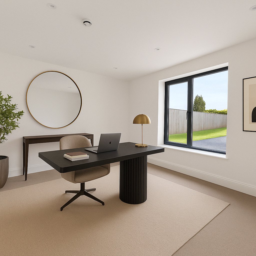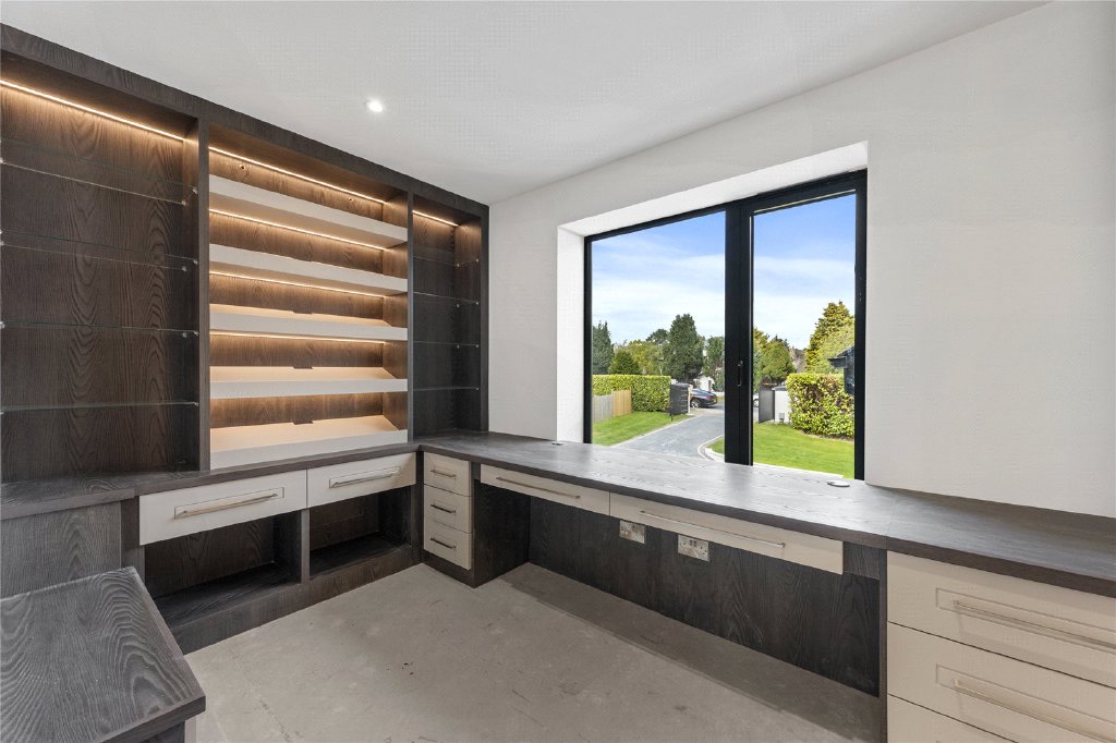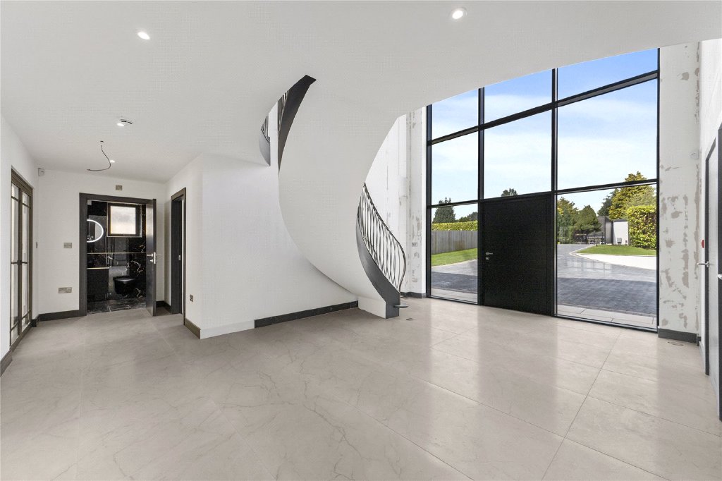 Upon entering, you are welcomed into a light-filled grand reception hall featuring stunning porcelain tiled floors and a dramatic cathedral-style ceiling. The space is anchored by a bespoke staircase with decorative balustrades that rise to a galleried first-floor landing. From the hall, all the principal reception rooms are accessible, including a formal lounge and dining room, both of which overlook the rear garden and open out onto the full-width patio via elegant bifold doors. Additional ground floor rooms include a study/home office, a cinema room for relaxed evenings, and a stylish guest w.c.