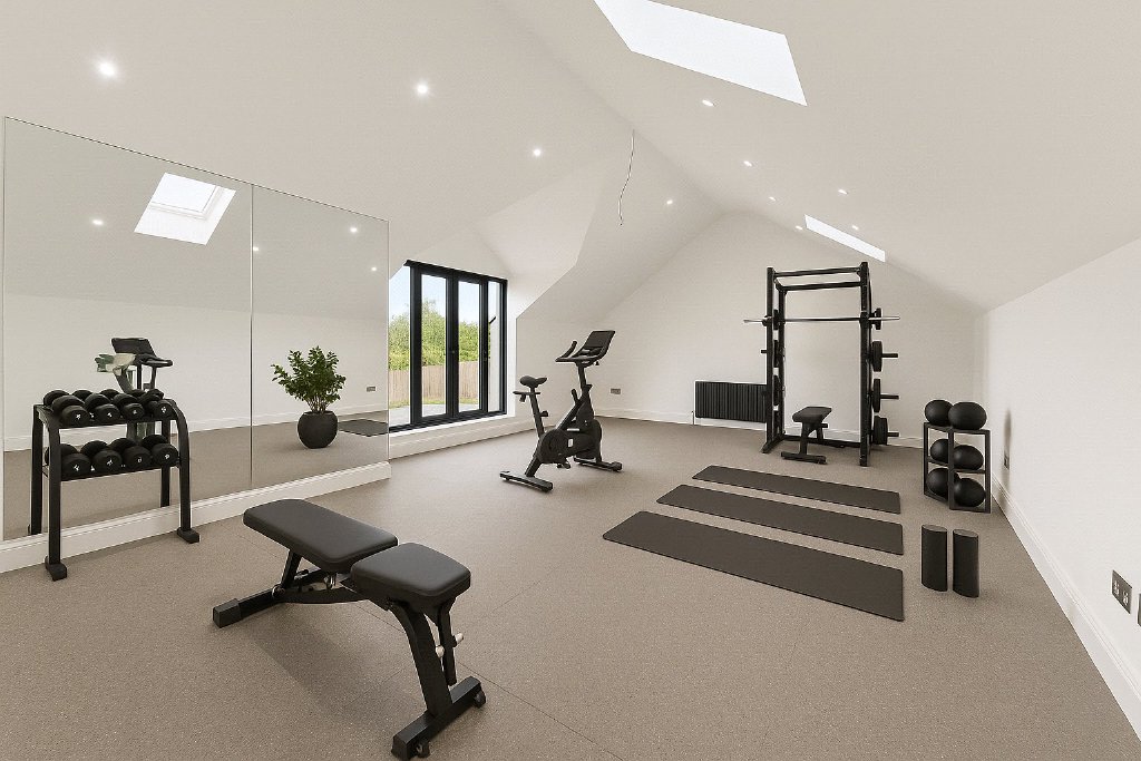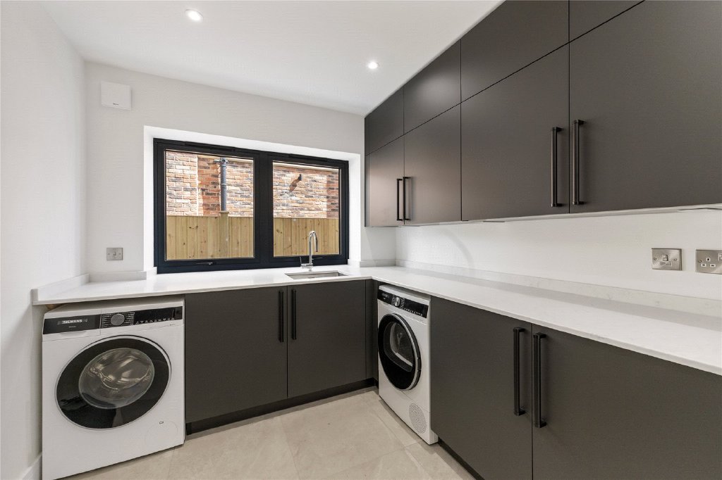 Adjoining the kitchen is a practical utility room fitted with contemporary base and wall units, tiled flooring, a built-in washing machine and tumble dryer, and access to a boot room with panelled walls, integrated storage, and bench seating. A hallway leads to a separate staircase rising to a self-contained area above the garage. This adaptable space, complete with Juliet balcony and fully tiled bathroom, is ideal as a home office, gym, or annex.