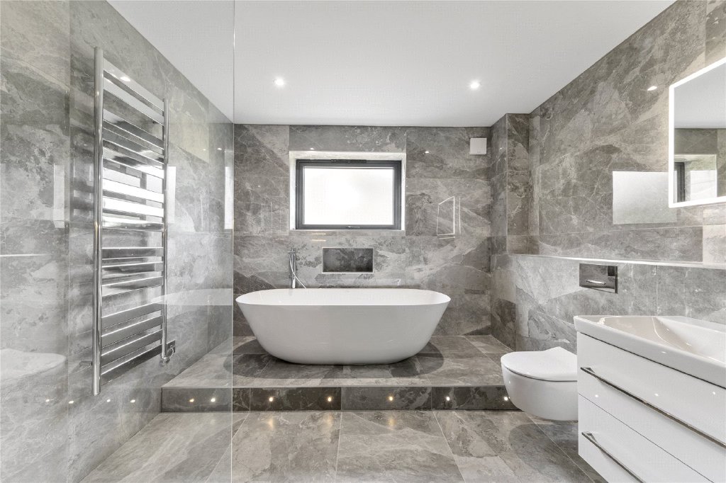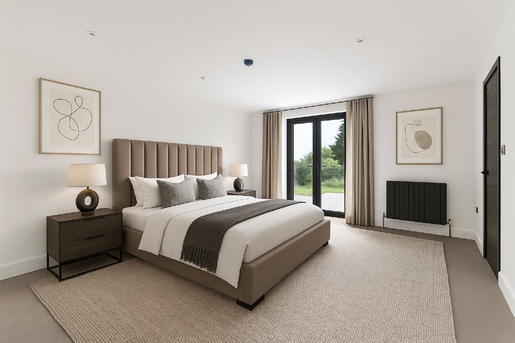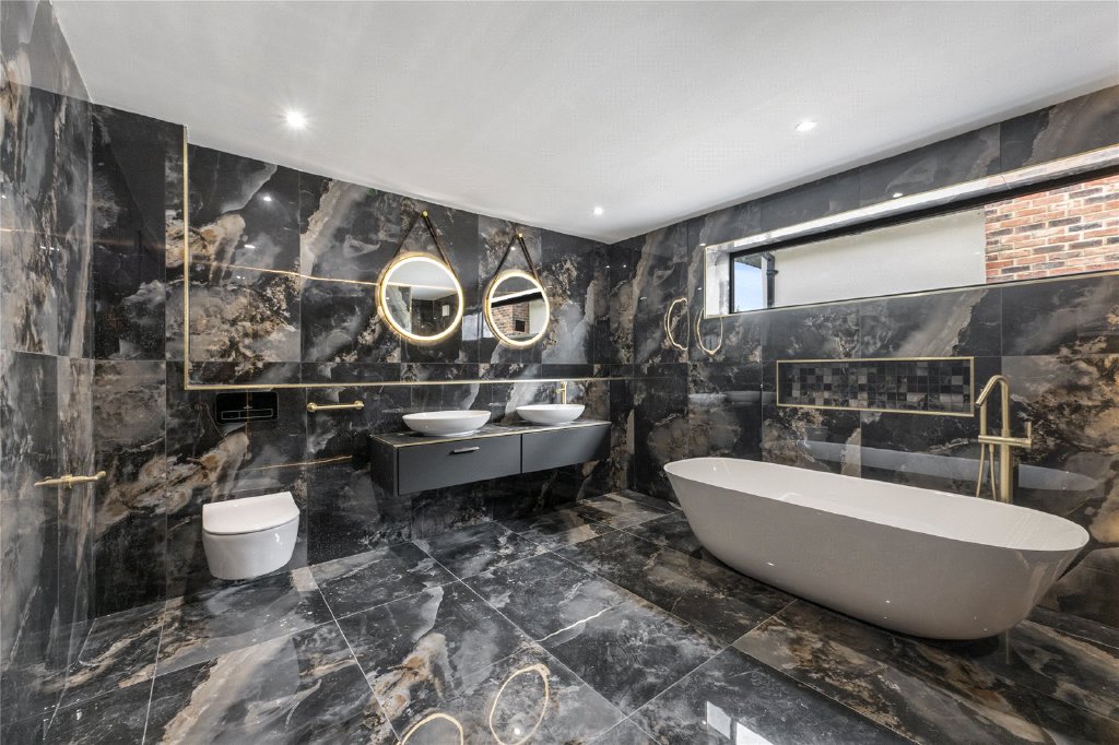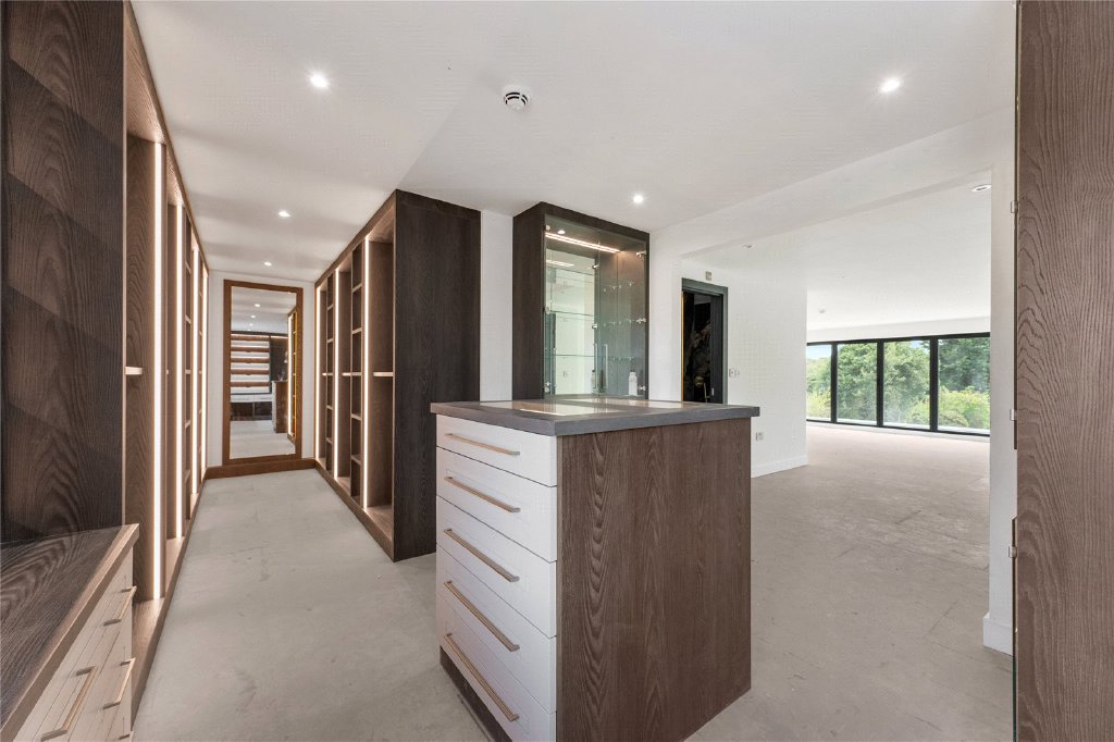 On the first floor, the main staircase opens to a galleried landing leading to four beautifully appointed bedrooms, three of which with en suite facilities. The principal suite is particularly impressive, featuring a generous bedroom with bifold doors opening onto a private south-facing balcony, a luxury en suite with freestanding bath, oversized walk-in shower, double vanity units, and heated towel rails. A spacious dressing room completes the suite with fitted wardrobes, a central island, display cabinets, dressing table and a full-length mirror. Two of the additional bedrooms share access to a south-facing balcony and have fully tiled en suite shower rooms, while the fourth bedroom, facing the front, also benefits from a luxurious en suite with walk-in shower and freestanding bath.