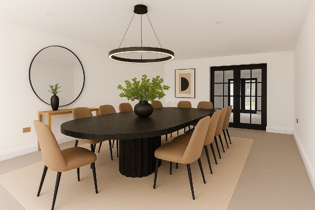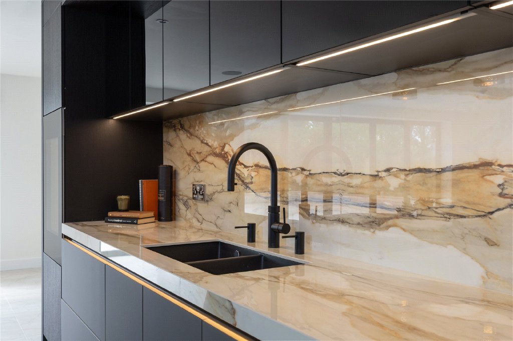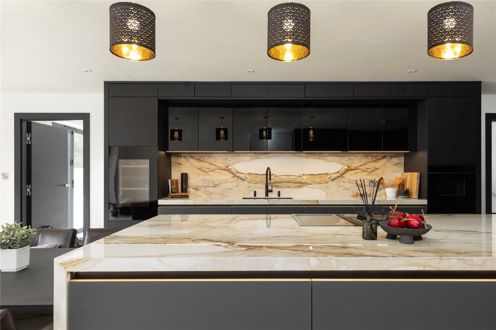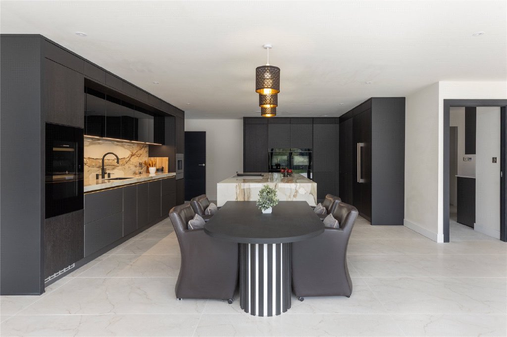 The heart of the home is undoubtedly the breathtaking open-plan kitchen and living area, custom-designed by Inspired Designs. This high-spec German kitchen features handleless lava black lacquered and knotty oak veneer units, integrated lighting, and lavish Antique Calacatta worktops. A large central island incorporates a bespoke dining table, bar seating, and an impressive media wall, creating the perfect hub for both family life and entertaining. Appliances are all top of the range and include a Bora Classic two-zone induction hob with Teppanyaki plate and integrated extractor, Studio Line ovens with warming drawers, a combi microwave with pulse steamer, a coffee machine, dishwasher, Liebherr Food Centre and the Liebherr wine cooler. This vast and versatile space is flooded with natural light via full-width bifold doors that seamlessly connect the interior with the rear patio and south-facing garden.