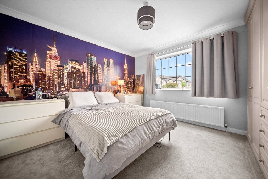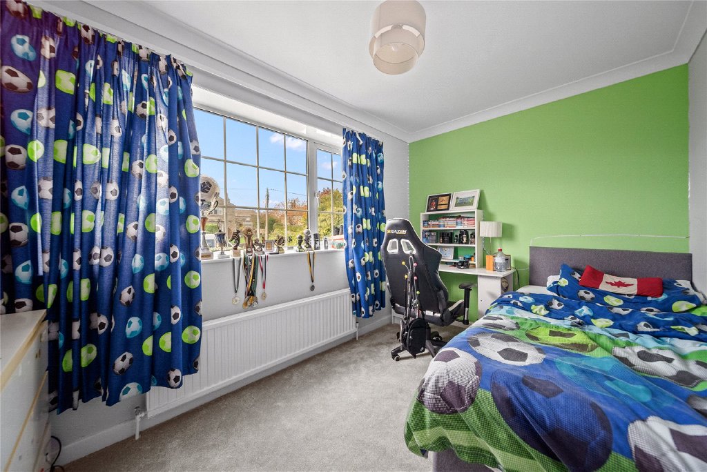 Upstairs, a generous landing with a large rear window continues the home’s light and airy theme. This floor hosts five well-proportioned bedrooms, whilst the principal bedroom is a true highlight, featuring bespoke fitted sliding wardrobes and uninterrupted views of the surrounding greenery. The luxurious four-piece family bathroom showcases modern design with a freestanding bath, large walk-in shower, navy vanity unit, and low flush w/c.