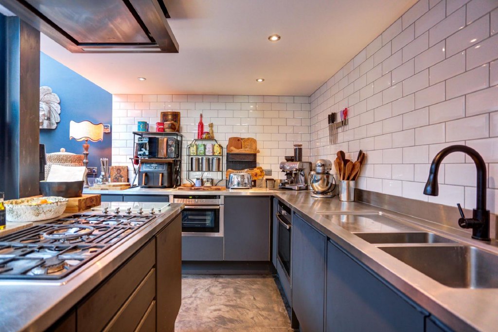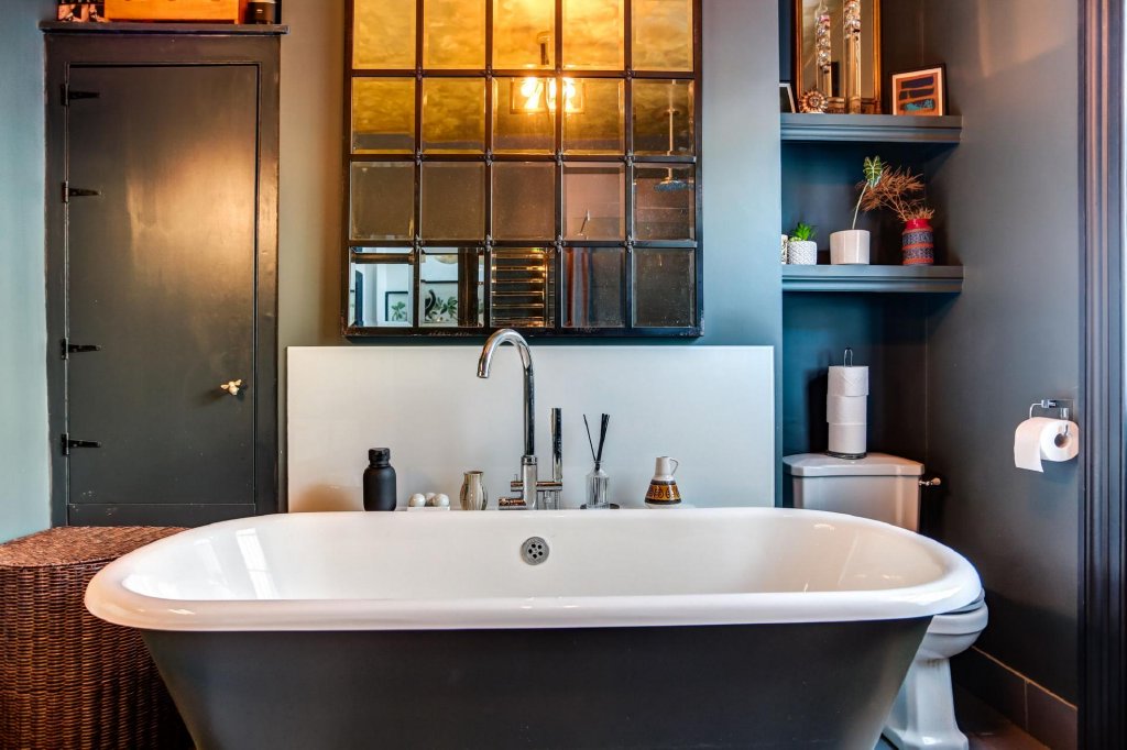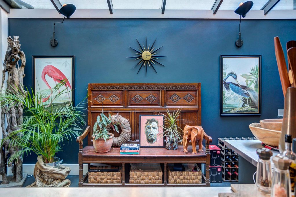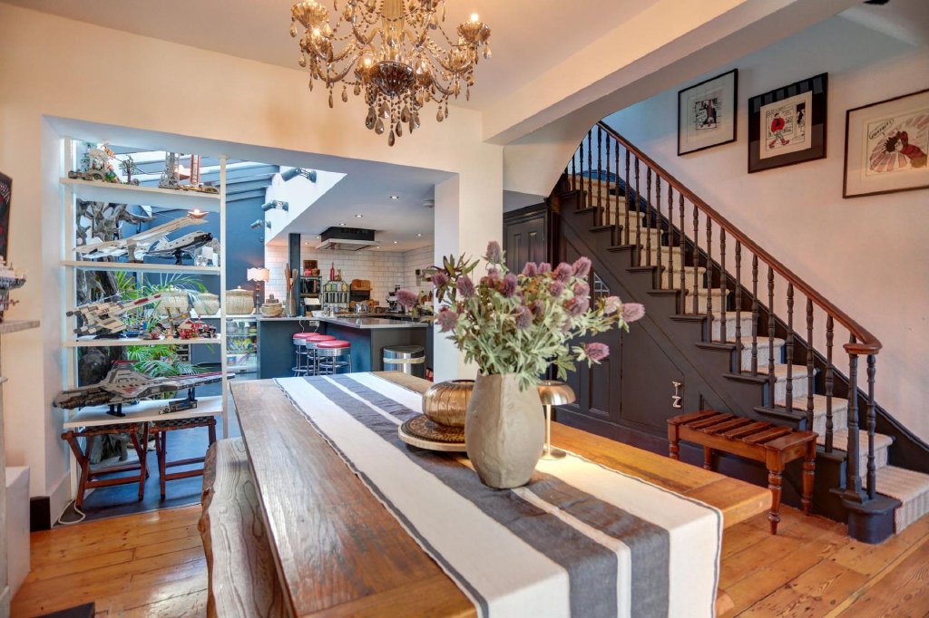 Flowing effortlessly from the kitchen/dining space, the living room is rich in character. Decorated in dramatic dark tones with elegant gold detailing, the space beautifully highlights the period features including the bay window, traditional wooden panelling and a charming painted tile fireplace depicting a pastoral scene of a diving House Martin into a calm stream. A cloakroom has been thoughtfully added beneath the stairs for guest convenience.