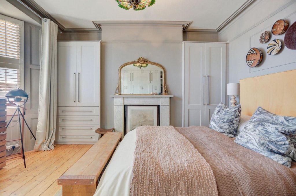 On the first floor, the principal bedroom is decorated in warm natural tones and benefits from built in wardrobes along the far wall and beside a beautiful marble fireplace. A curving mahogany balustrade leads to the second floor where two further double bedrooms are served by a Jack and Jill bathroom. From the landing, a ladder accesses the insulated and boarded loft room with Velux windows, ideal for storage or an unofficial teenage retreat.