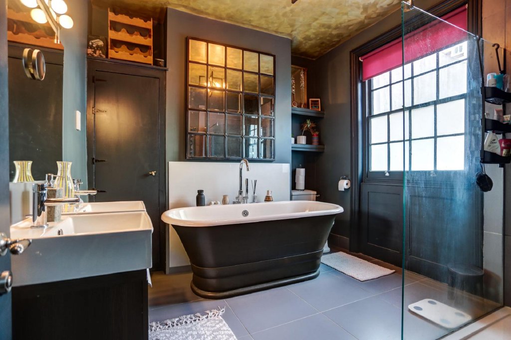 The main family bathroom delivers five star luxury, finished in striking black tiles with white veining. A freestanding bath, separate shower, WC and twin sinks create a spa like feel.