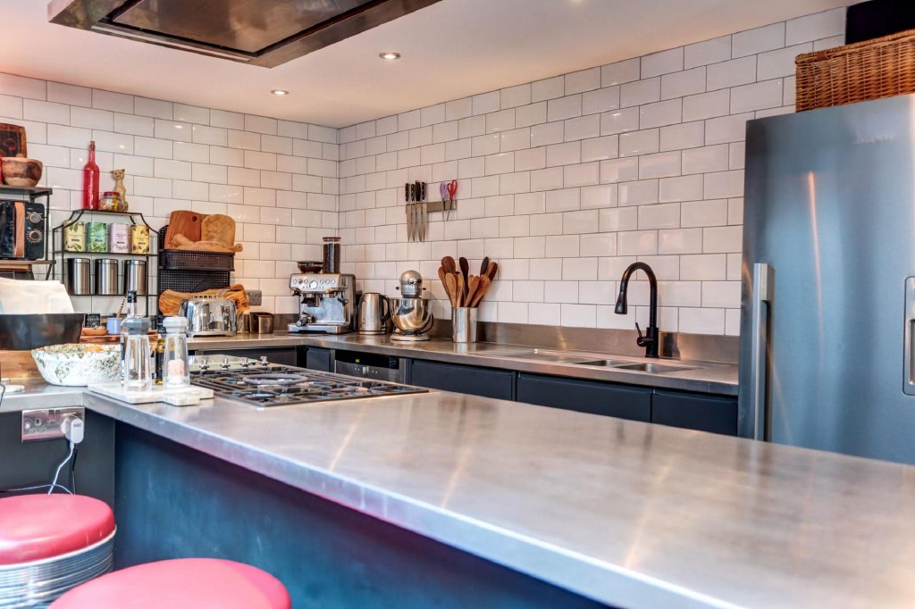 On the half landing, a bright and tranquil office space offers an ideal work from home setting, creative studio or painting retreat thanks to the abundance of natural light. A cleverly hidden Murphy Bed allows this room to be offered up as further bedroom for those times when extra guests have arrived. From here, doors open onto a sunny and private west facing terrace garden.