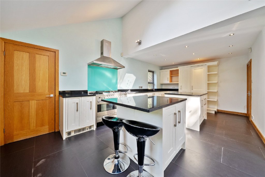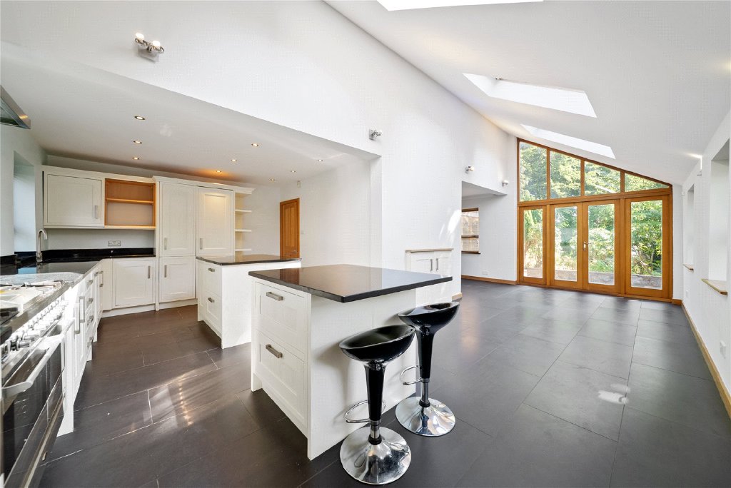 The ground floor is designed with both family living and entertaining in mind. A bright and airy kitchen extension forms the heart of the home, with fitted wall and base units, a central island with seating, integrated appliances, and underfloor heating for year-round comfort. This leads seamlessly into the dining kitchen and family area, offering an open, sociable space that’s perfect for mealtimes, gatherings, or simply relaxing.