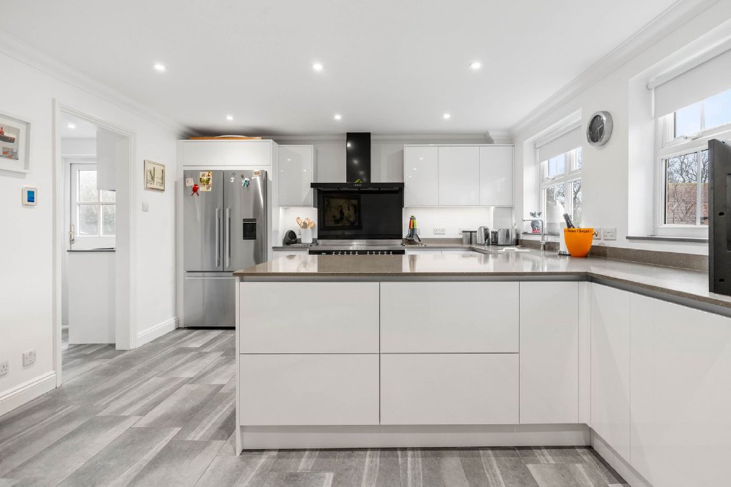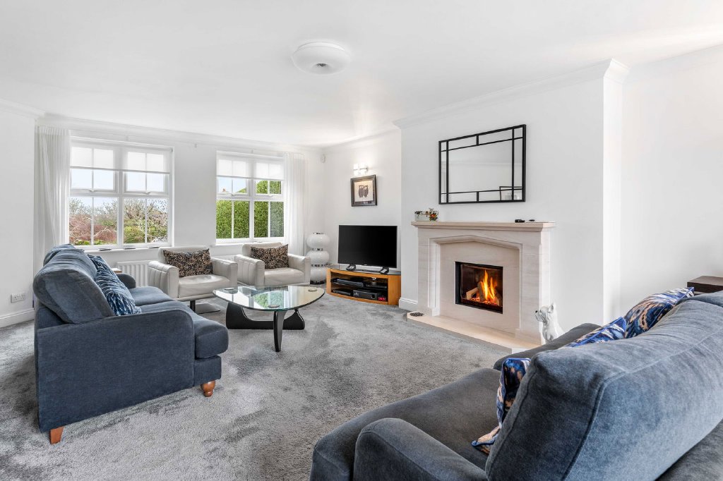 Designed for both refined entertaining and relaxed family living, the ground floor accommodation flows effortlessly between beautifully appointed spaces. The principal reception room, a magnificent 22ft dual-aspect space, features a stone fireplace with integrated fire and expansive bi-folding doors opening onto the south-facing garden, creating a seamless connection between interior and exterior living. A second reception room, currently arranged as a formal dining room, also benefits from bi-folding doors and offers flexible use as an additional entertaining or family space.