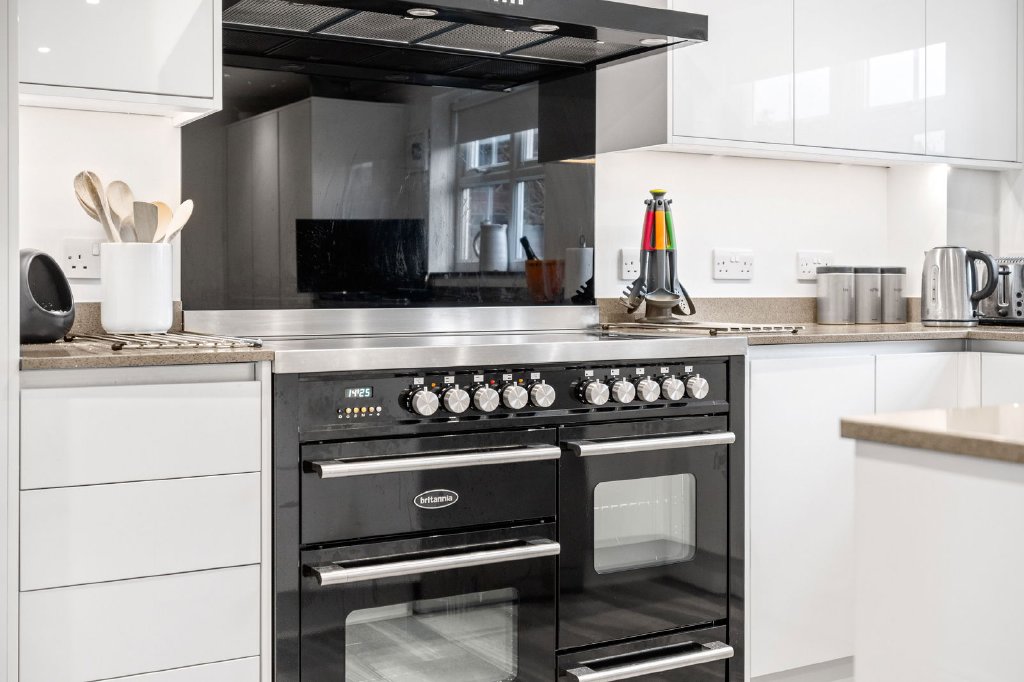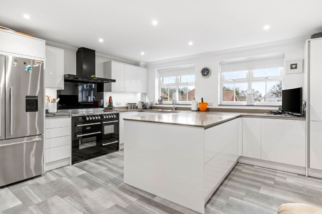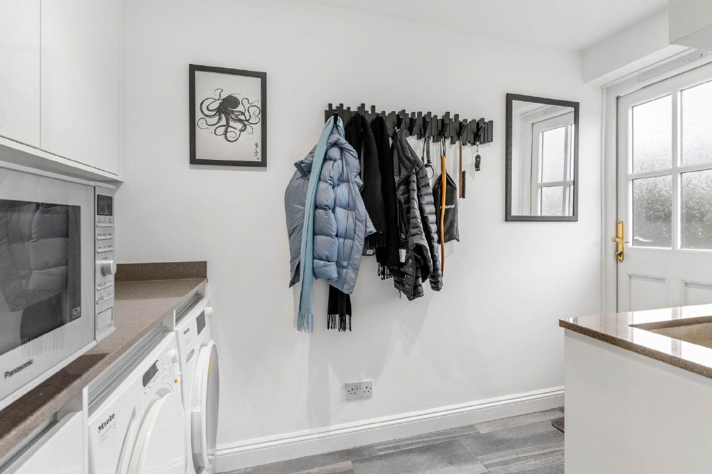 At the heart of the home lies the bespoke kitchen and breakfast room, appointed with quartz work surfaces, a statement range cooker, integrated appliances and an elegant breakfast dining area. A separate fitted utility room provides discreet practicality with an external door to the side of the property.